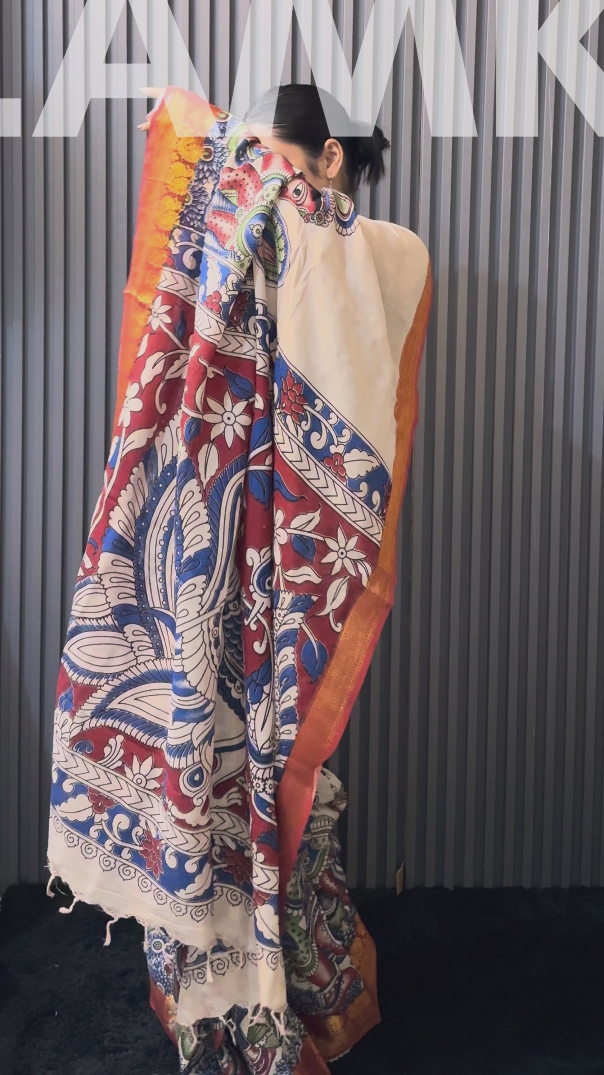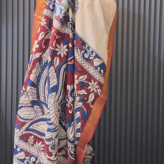 Ira - Beige kalamkari silk saree with Mythological & Peacock Motifs