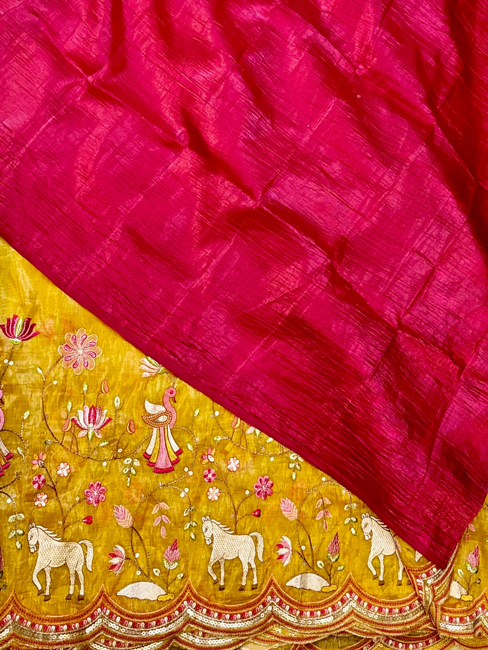 A radiant ode to tradition, Kanakangi is a golden crush tissue silk saree adorned with exquisite hand-stitched Kalamkari embroidery. The border is brought to life with vivid motifs of dancing peacocks, blooming florals, and prancing horses—each element meticulously crafted using multicolour resham threads. The soft crushed tissue base shimmers with every movement, while dainty mirror-like sequins are scattered across the body for a subtle sparkle. The saree is paired with a bold contrast blouse in jewel-toned magenta, complementing the artistic embroidery with flair.