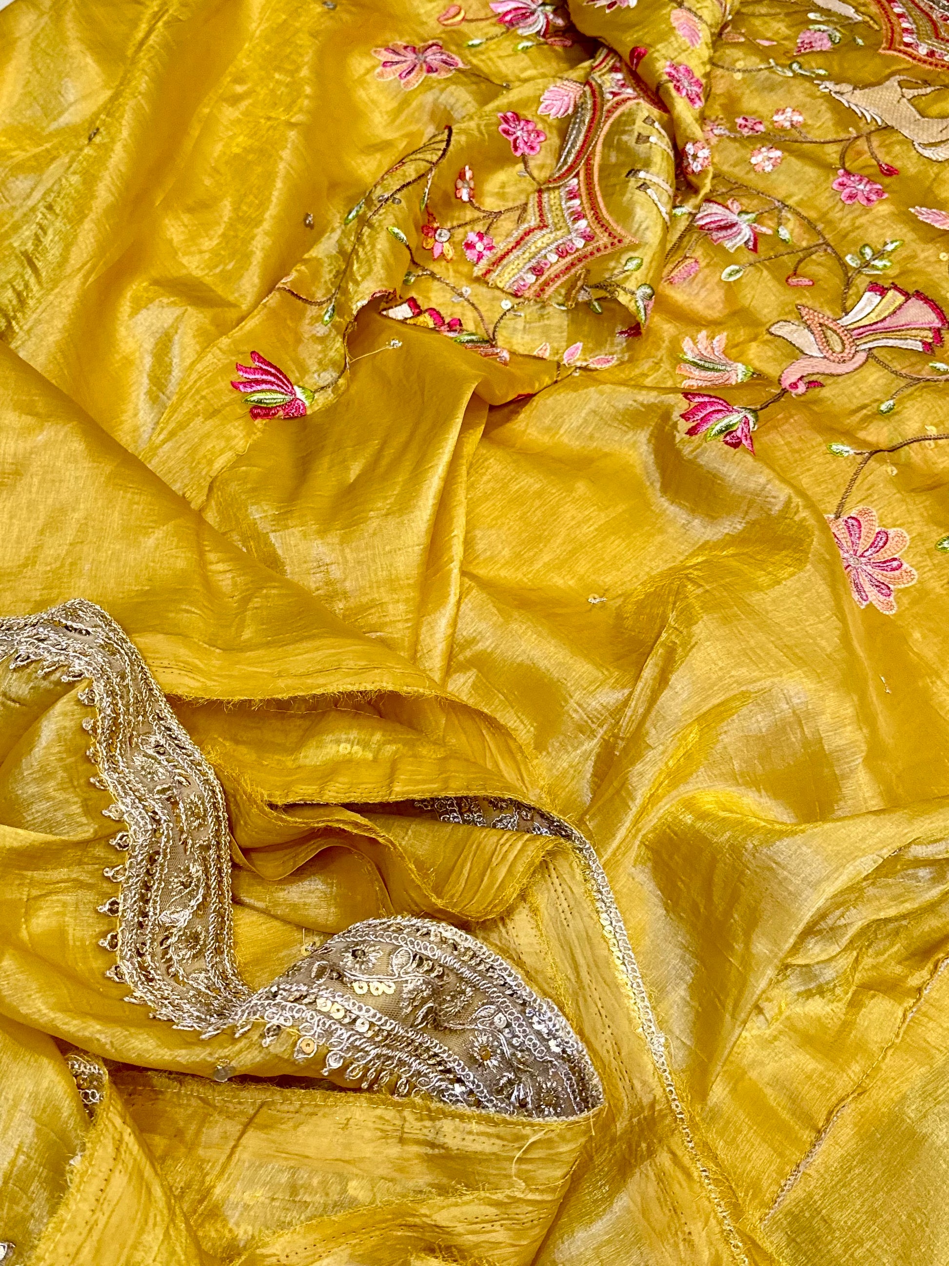 Colour Palette: Antique gold base, multicolour resham embroidery, deep magenta blouse