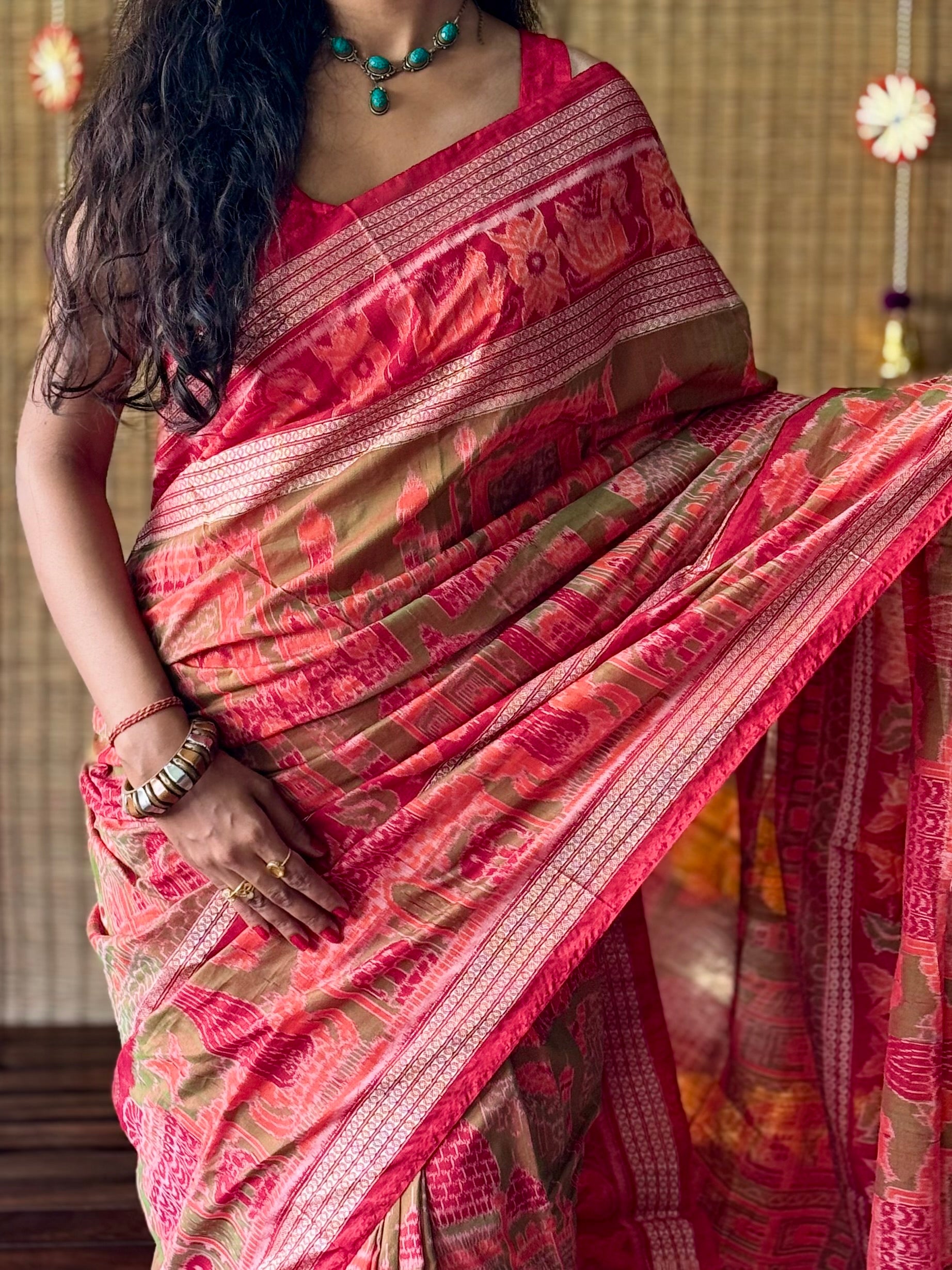 Kesariya - Red & Olive green Sambalpuri Silk-Cotton Saree