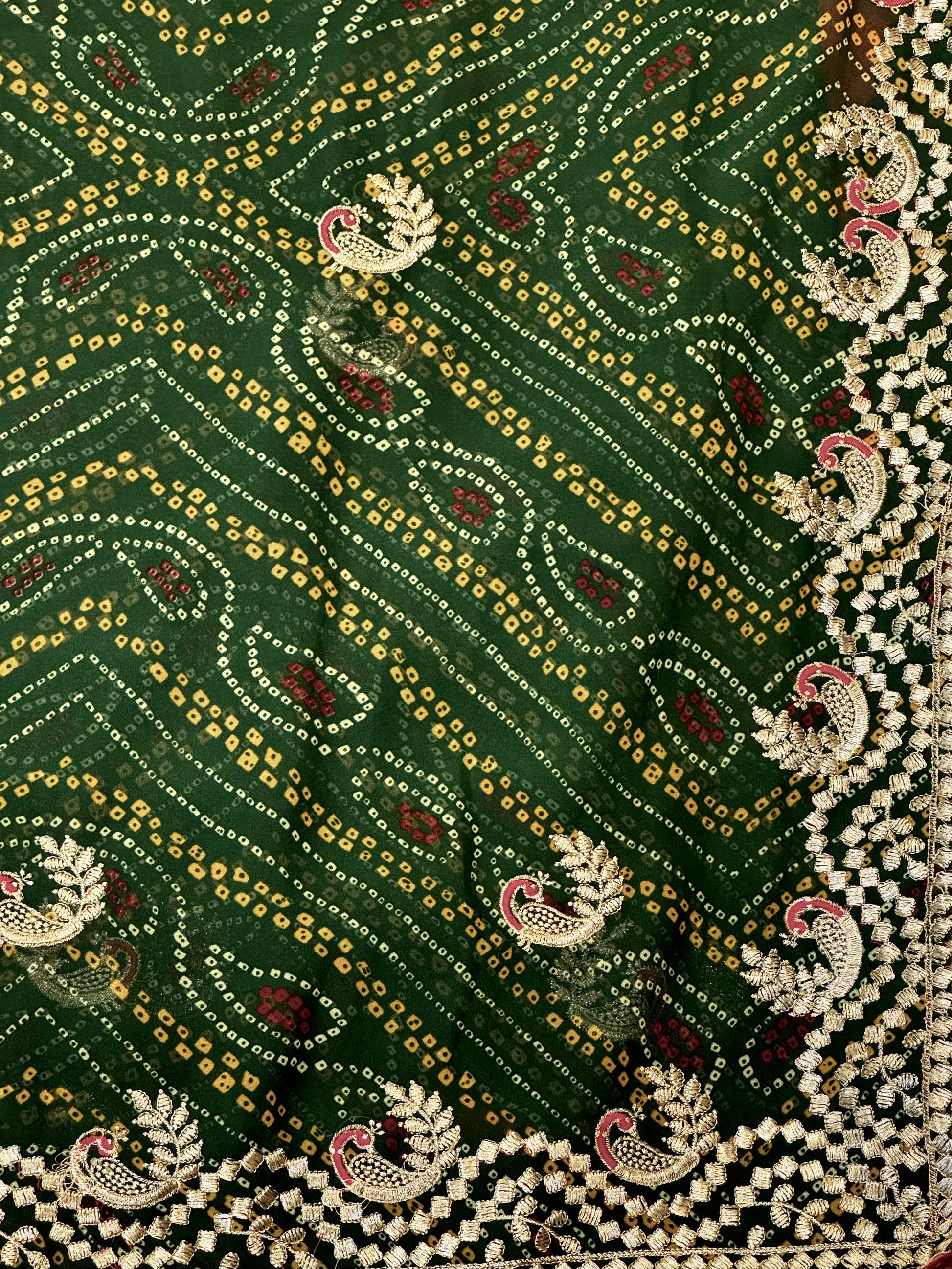 Kumkum – A Handcrafted Green Bandhani Saree with Gota Embroidery