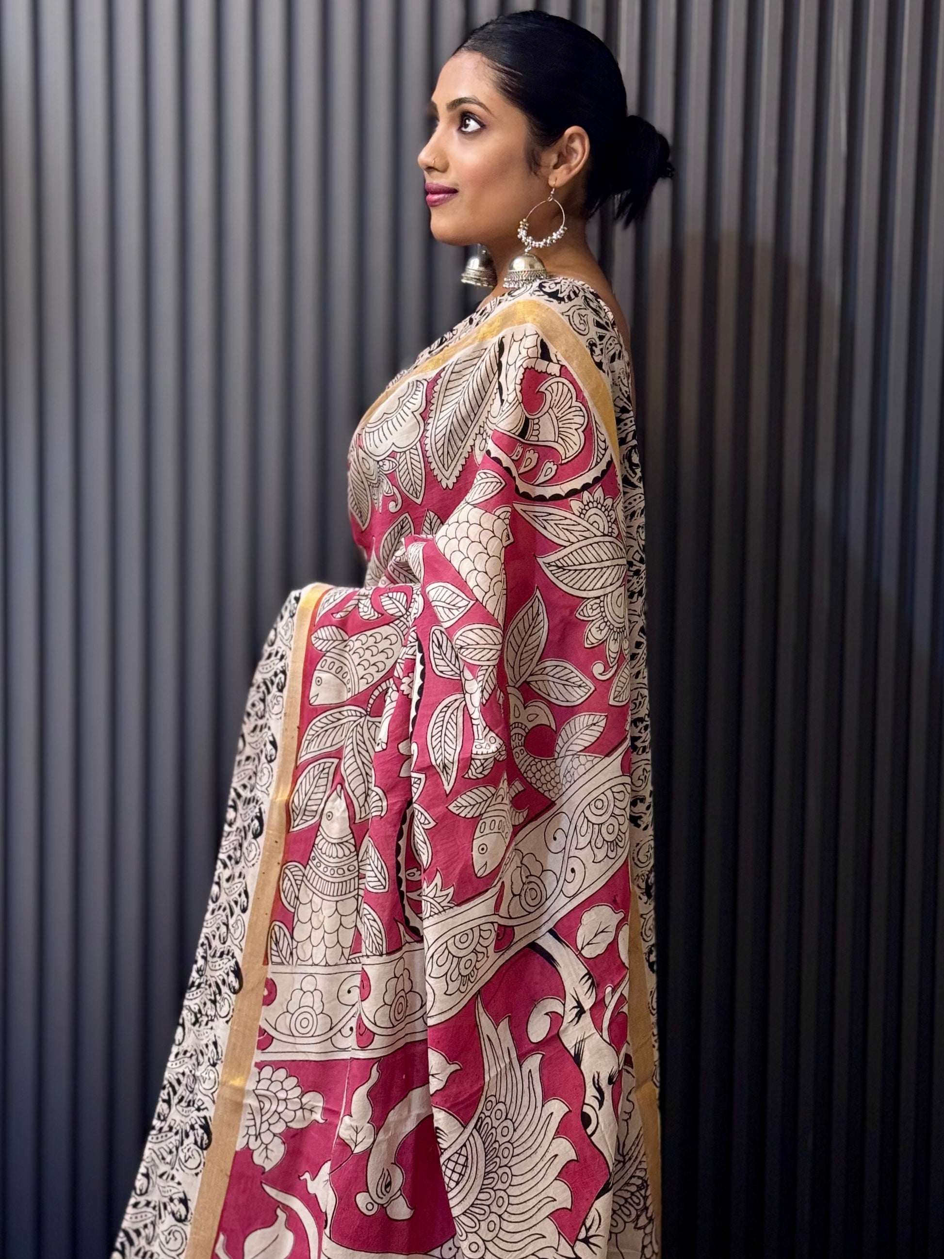 Graceful and rooted in tradition, this hand screen-printed Kalamkari saree in rich Nellore silk captures timeless artistry. Featuring a soft pink body adorned with intricate fish and floral block prints, the saree is elevated by a statement pallu showcasing majestic peacocks and traditional motifs in natural hues. A striking black floral border with delicate gold piping adds a bold yet elegant contrast. Lightweight and fluid, it’s a perfect blend of heritage charm and contemporary grace.