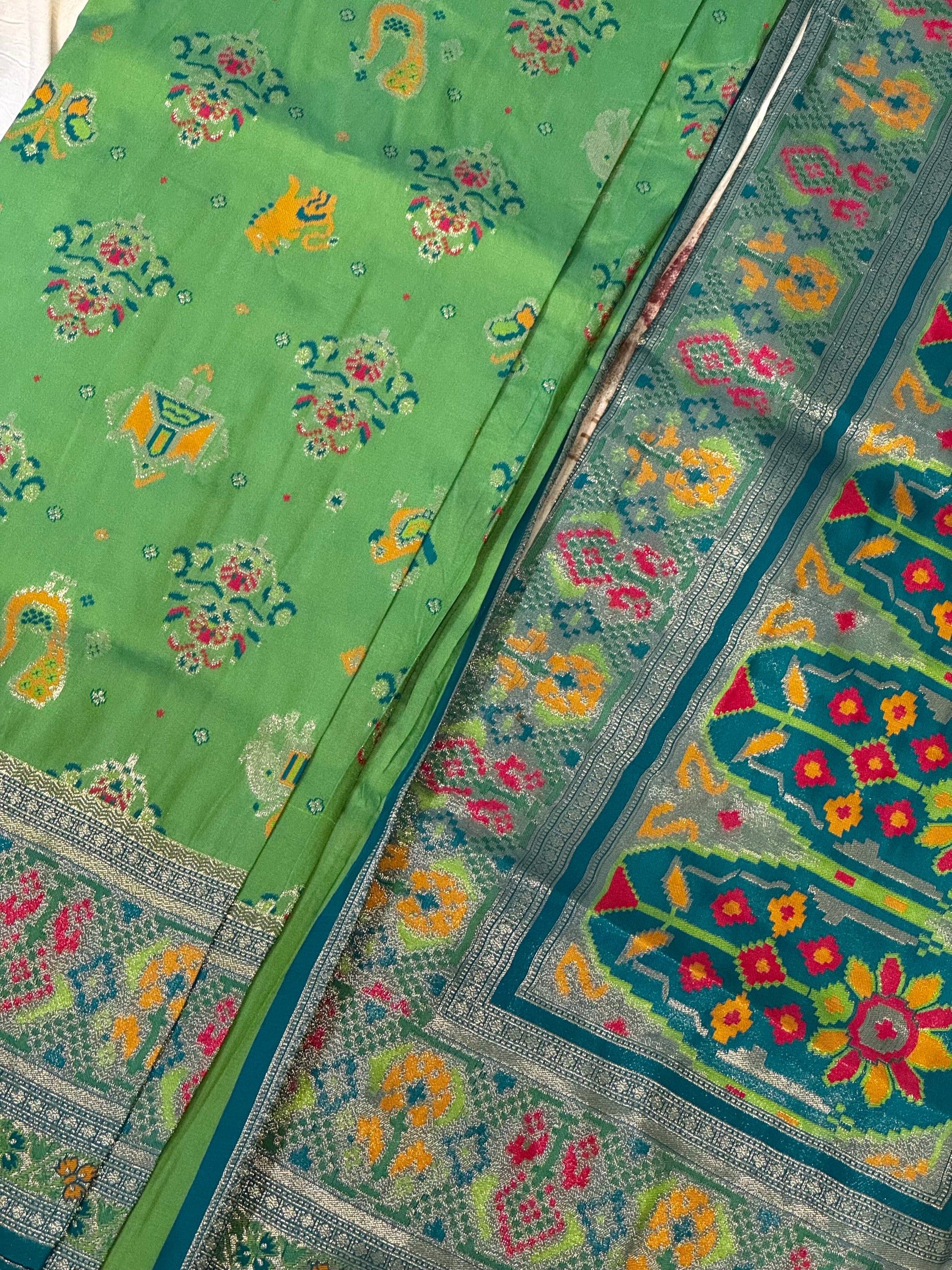 Morni – A Handwoven Green Patola Saree with Peacock and Elephant Motifs, Accented by a Teal-Silver Zari Border