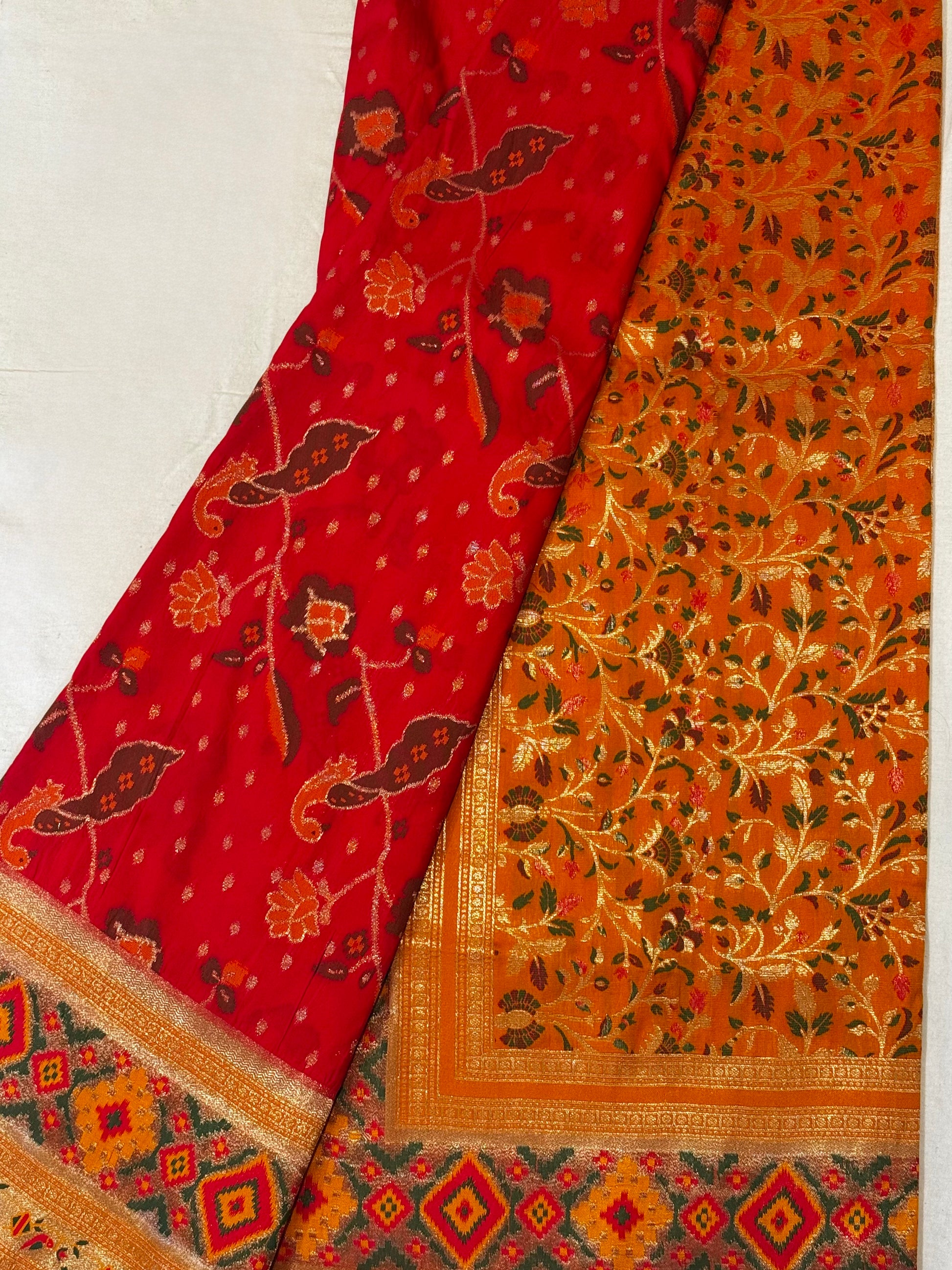 The stunning orange contrast pallu glows with elaborate vine and leaf patterns, while the golden zari border with geometric ikat motifs in yellow, red, and green adds a rich, traditional charm.