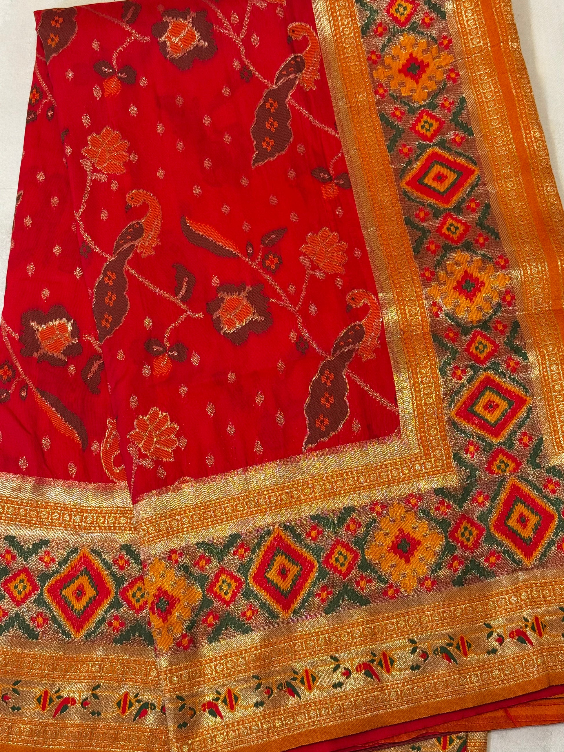 Design Elements: Floral and paisley motifs with golden zari and geometric ikat border