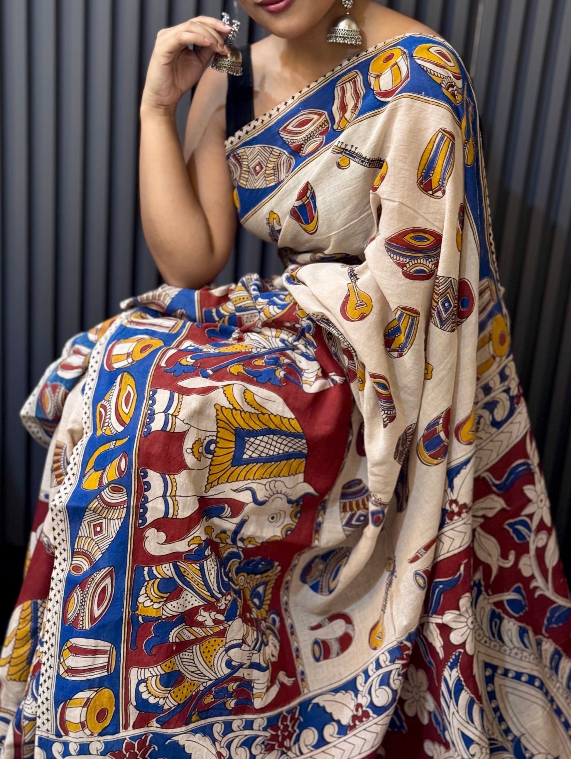 Celebrate art and rhythm with this hand screen-printed Kalamkari saree made from soft, breathable mul cotton. The natural cream body is adorned with vibrant motifs of traditional Indian musical instruments like veena, tabla, mridangam, and conch shells, evoking a sense of cultural nostalgia. The pallu comes alive with dramatic depictions of peacocks and mythological figures, detailed in earthy hues of red, blue, mustard, and black. Lightweight and fluid.