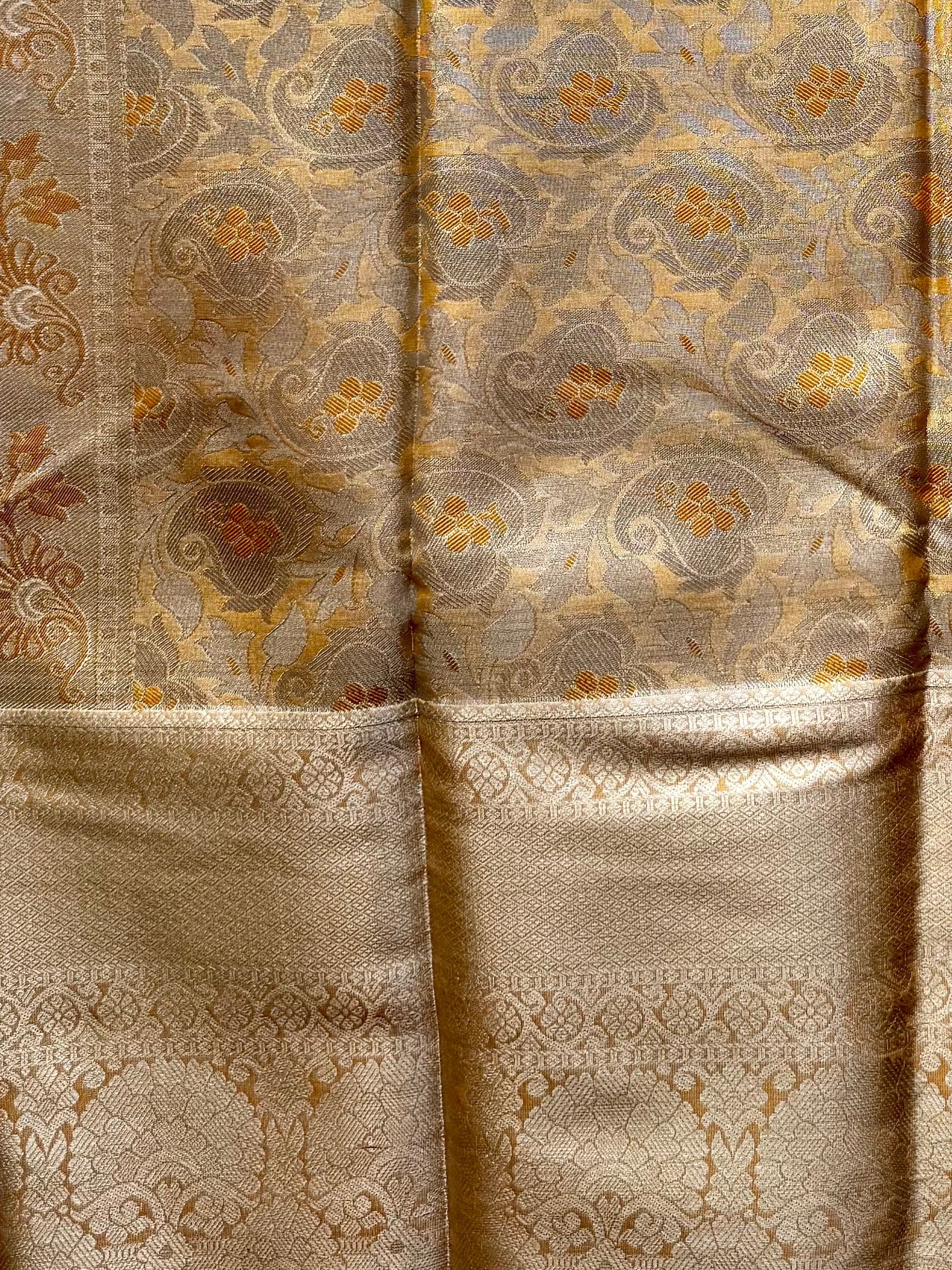 This luxurious tissue Kanchipuram silk saree features a harmonious blend of antique silver and gold zari, creating a majestic, luminous finish. The body is adorned with intricate floral and vine motifs in silver zari, subtly highlighted by mustard-gold threadwork for a soft yet opulent sheen. A self-design saree, it carries a rich golden pallu that seamlessly mirrors the body, while a contrasting golden blouse adds definition. Traditional geometric buttas on the pallu and border enhance its timeless elegance a true testament to heritage and artisanal mastery.