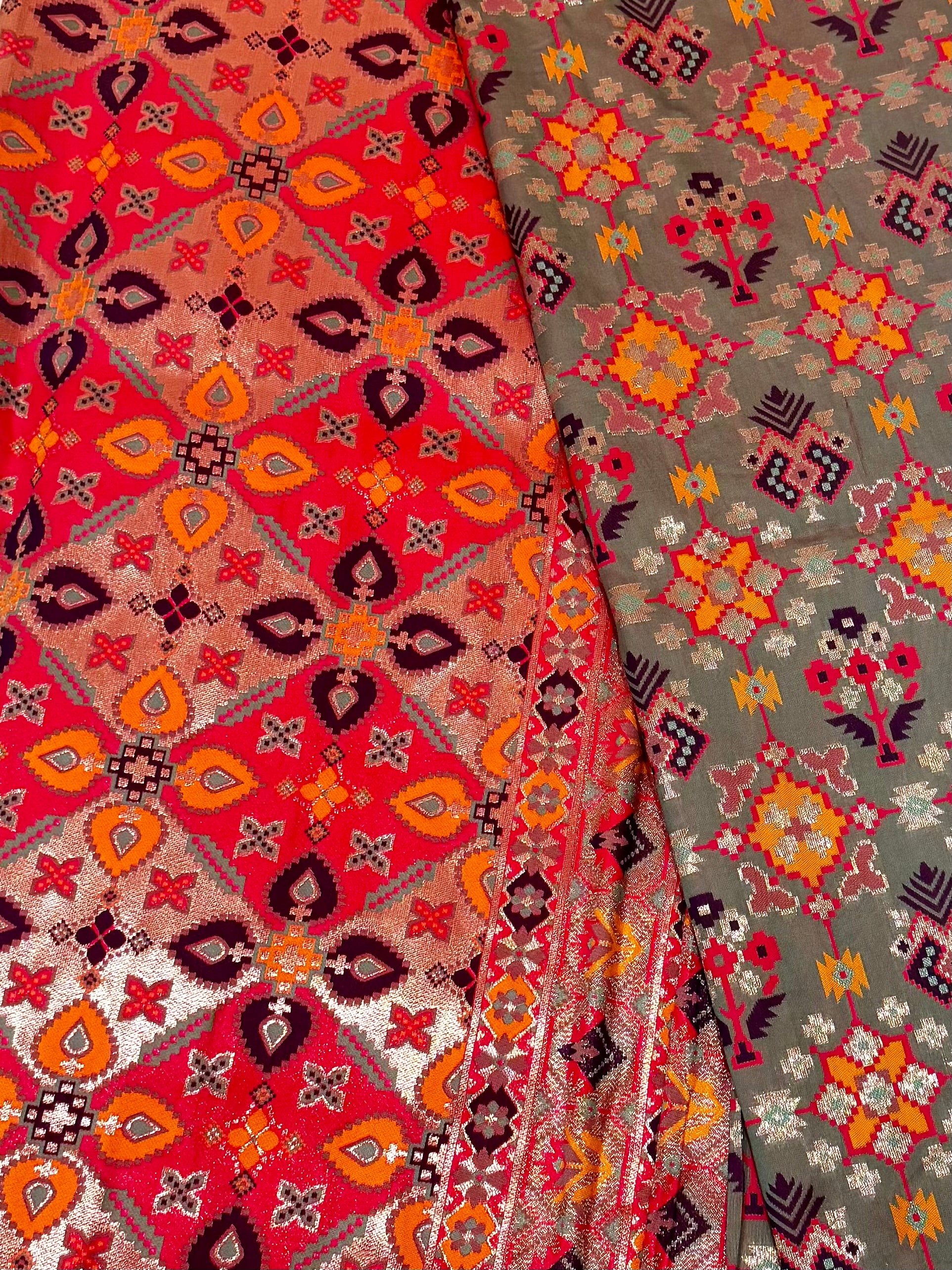 Design Elements: Traditional geometric and floral Patola motifs with copper pink zari border